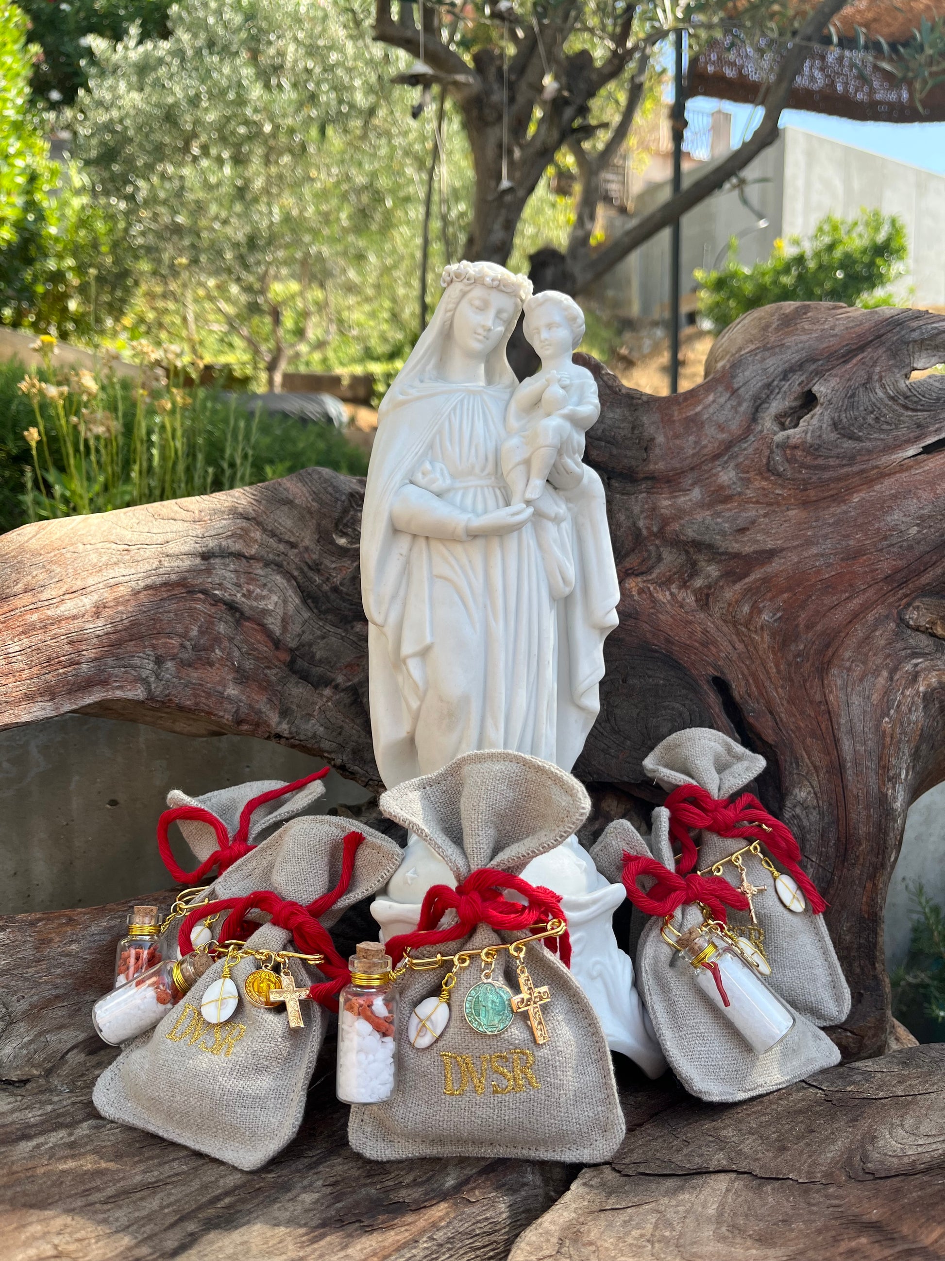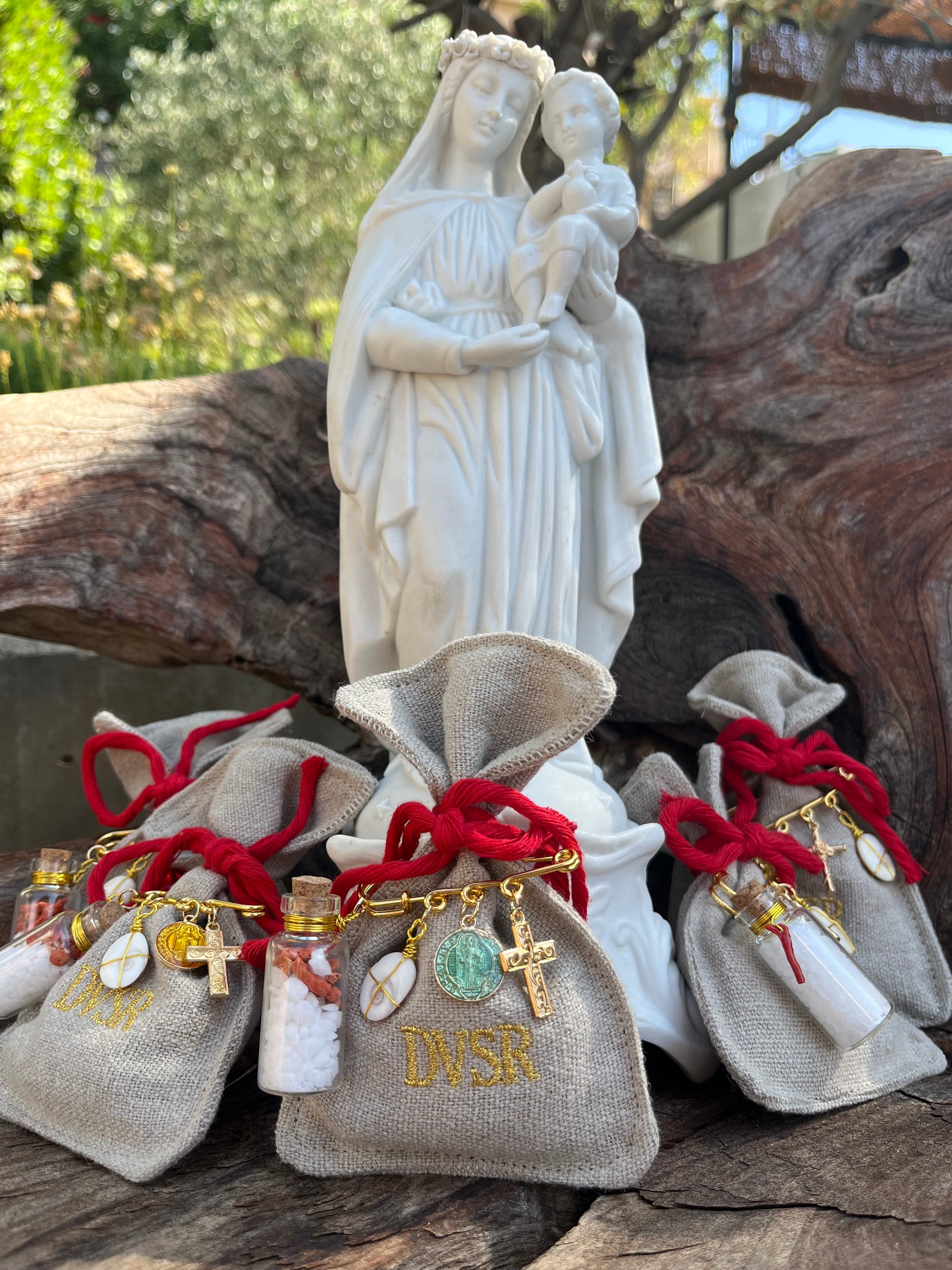 Vous retrouverez sur votre pochon une épingle comportant : flacon de gros sel et corail, Œil de Ste Lucie, médaille de la Vierge, croix.